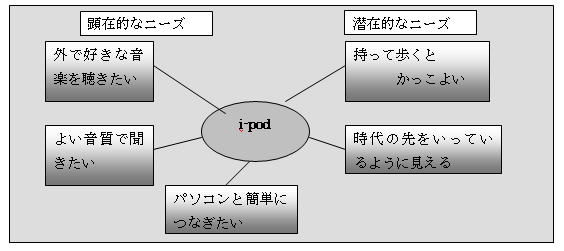 たとえば東芝の「ギガビート」というハードディスク内蔵MP3プレイヤーは、かなりこの分野では初期に開発・発売された商品である。この商品は比較的マニアックな層に売れていたが、この種の商品で爆発的にヒットしたのはi-podが発売されてからである。当初の消費者のニーズは好きな音楽を大量に持ってアウトドアで聞きたいというニーズであったが、そのニーズはすぐに「外で使うのだから他人からかっこよく見られたい」というニーズに変わっていった。これを先読みできたi-podがこの市場を席巻したのである。