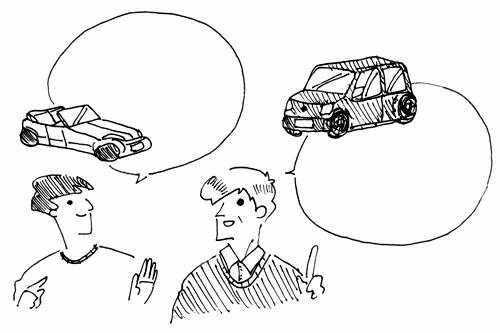 図 投影法 二人の若い男性が自分の乗っているクルマについて語っています。自由に話している内容を記入して下さい。
