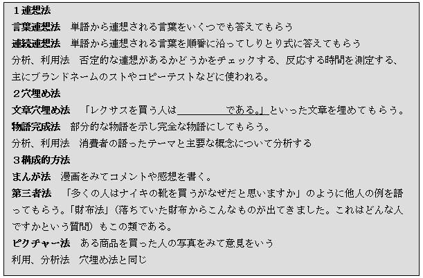 表は比較的よく使われる「投影法」の手法である。投影法は1950年、60年代によく使われていたが、70年代、80年代に大量のサンプル調査が行われるようになってからあまり使われなくなった。しかし投影法は豊かな消費者洞察を得る方法として近年再び使われるようになってきている。